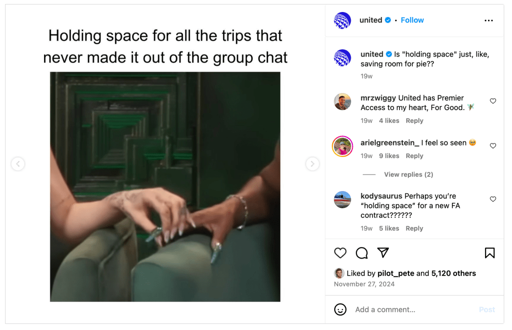 United Airlines [@united]. (2024, November 27). Is “holding space” just, like, saving room for pie?? [Instagram post]. Instagram. https://www.instagram.com/united/p/DC4065dyyvz/?img_index=2.